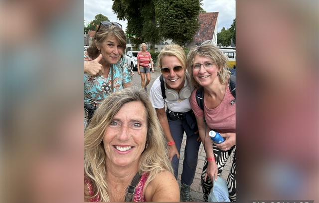 Precies toen we tussen het publiek terug op de route kwamen, zagen we Floor en Mijke recht op ons aflopen. Van de 45.000 mensen. Dat verzin je toch niet? Weer een mirakel! Dankzij een blaren-behandeling en een paracetamolletje waren ze weer fris en fruitig en gingen de laatste kilometers in. Ondertussen deed ik bijna in mijn broek, en wist niet hoe snel ik de rolstoel uit moest om hupsend bij de mensen achterom naar het toilet te gaan. Opgelucht en blij konden we verder. Lonneke wisselde bij het hotel haar accu even om, zodat zij in elk weer ‘vol’ was. Ons tafeltje bij De Vereniging was wonderwel weer vrij en daar sloten we deze twee mooie dagen samen met een laatste afzakkertje af.