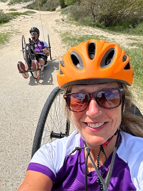 Mijn redder in nood draaide rechtsomkeer en kwam terug mijn kant op. Nuchter en praktisch als hij is, bedacht hij een manier om veilig thuis te komen. Klimmen was het probleem niet, maar bij het dalen zou ik achter zijn fiets moeten plakken. Ik moest letterlijk bumperkleven, zodat hij mij kon afremmen. Tien kilometer lang. Op het begin was het doodeng, want soms ontstond er best wat afstand, waardoor ik als een soort botsauto steeds tegen zijn bike aan beukte. De mannen die we eerder gesproken hadden kwamen we onderweg tegen en zij boden aan met een touw mij af te remmen. Heel lief, maar wij hadden inmiddels onze modus gevonden. Daar reden we als Jut en Jul, Sjaan Kleefaan achter elkaar aan de duinen door. Het viel op dat sommige voorbijgangers het zichtbaar een vreemd tafereel vonden. Anderen dachten dat ik mijn maatje aan het voortduwen was, in plaats van andersom, wat soms ook het geval was, haha. Uiteindelijk kwamen we weer in de bewoonde wereld en zijn we via Bloemendaal, nee niet over het Kopje, terug gereden. Ik slaakte een diepe zucht, toen we weer veilig ’thuis’ waren.